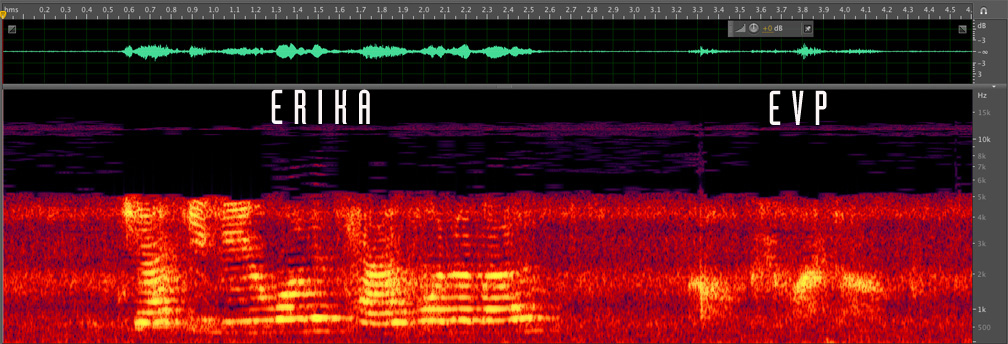 The screen shot below is a spectral view of the womens changing room vocal anomaly. Note the horizontal stripes in Erika's voice that displays vocal vibrations caused by her larynx. They usually can be seen in sounds originating from flesh and blood voice boxes. The potential EVP in question doesn't show striping and displays characteristics of a inanimate object or environmental noise. Yet, we're sure we hear a clear, intelligent vocal response.