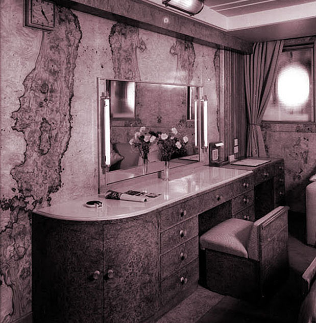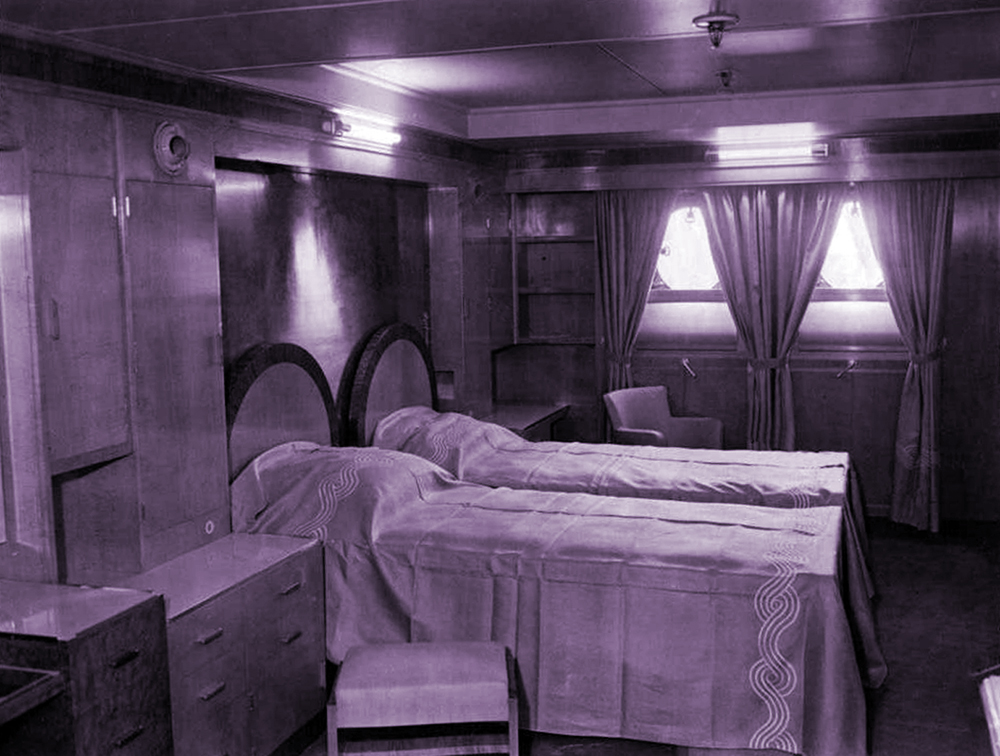 M119: A guest reports seeing a woman in a brown dress with a pink bow tied to her waist sitting in the chair next to the room's porthole. When the mysterious woman stands-up and begins walking to the door, she instantly vanishes. "It was as if she turned into a mist", said the guest.